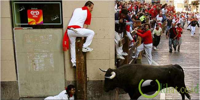 [lihat.co.id] - Tradisi yang berjalan turun temurun di Spanyol dan tetap dijalankan walau sering memakan korban. Tradisi diuber banteng ini dilakukan untuk menghormati santo pelindung.