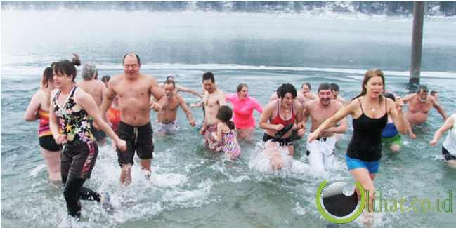 Tradisi bernama Polar Bear Plunge ini menjadi ritual wajib di setiap musim dingin. Mereka terjun ke danau atau kolam yang dingin. Ritual ini sangat berbahaya karena bisa mengakibatkan hipotermia bahkan kematian.