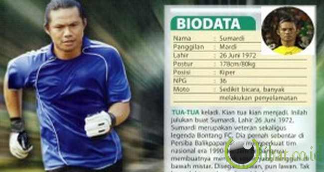 [lihat.co.id] - Last but not Least, Sumardi layak diberi gelar salah satu kiper terbaik Indonesia, memperkuat Tim Nasional era 90-an, Sumardi dikenal dengan kesetiaannya membela klub PKT, tahun lalu Sumardi sempat memperkuat Deltras Sidoarjo, dan tahun ini kembali ke PKT yang berubah menjadi Bontang FC. sulit dibobol lawan, ciri khasnya adalah rambut kuncirnya.