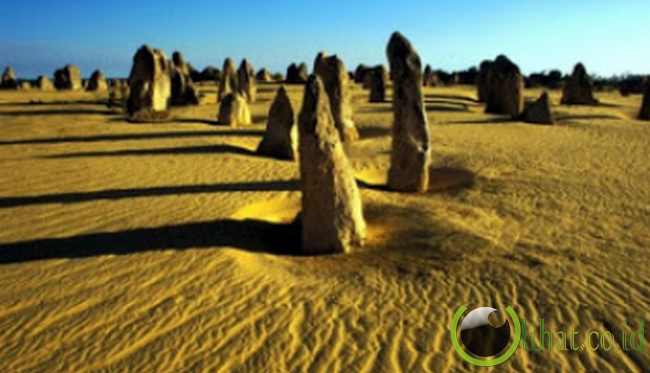 [lihat.co.id] - Gurun Pinnacles misterius terletak di Australia Nambung National Park. Ribuan pilar batu kapur bangkit dari pasir gurun. Yang aneh formasi batu kapur mencapai hingga empat meter.
