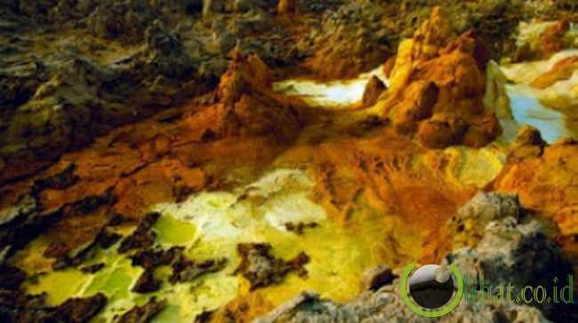 [lihat.co.id] - Tempat yang dihuni terpanas di bumi. Jika suhu rata-rata sepanjang tahun di Ethiopia adalah 94 derajat Fahrenheit, suhu teratur melebihi 115 derajat di Depresi Danakil, di mana gunung berapi Dallol berada Pada sekitar 157 meter / 48 m di bawah permukaan laut, Dallol adalah gunung berapi tanah terendah planet