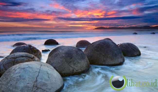 [lihat.co.id] - Tersebar di sepanjang pantai Koekohe indah di Selandia Baru, ini batu-batu yang luar biasa besar menarik wisatawan dari seluruh dunia. Menurut Society for Geologi sedimen, "adalah batu-batu Moeraki konkret kalsit besar dengan urat septarian kalsit dan langka stadium akhir dolomit kuarsa dan besi".